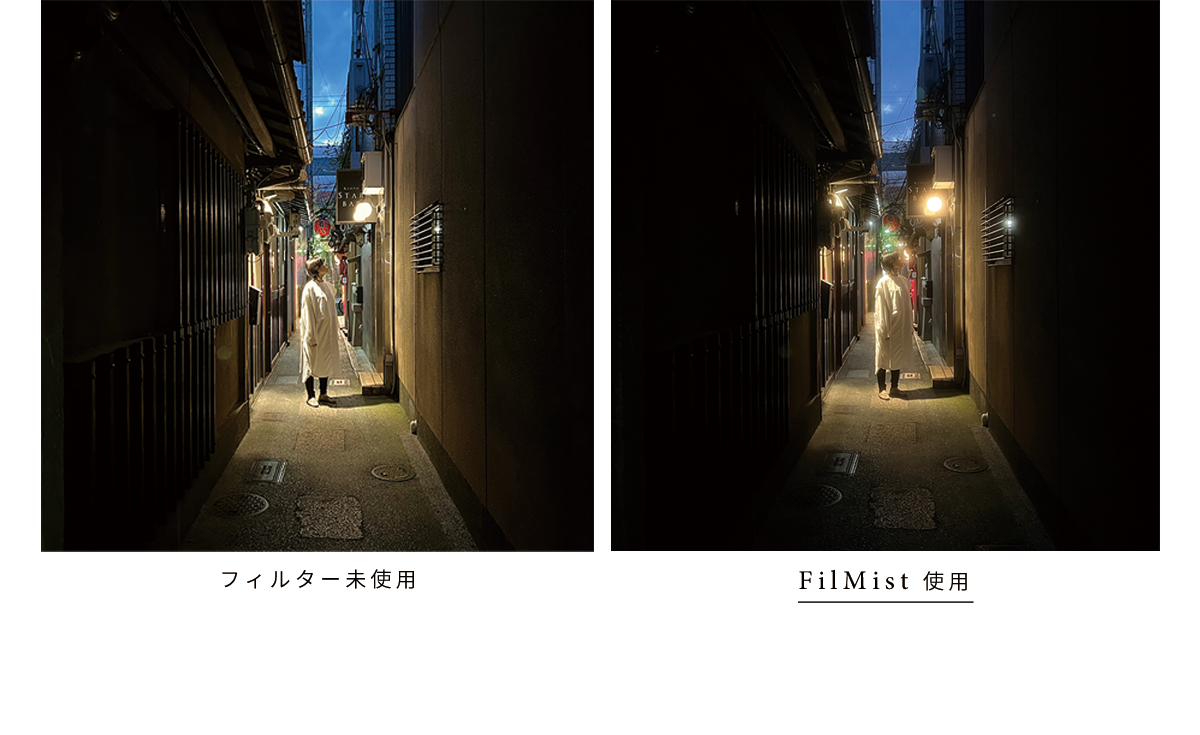 黒いナノ粒子を含んだ光学ガラスが、そのカットに映る光源の周りに霞のような効果を生み出すことで、まるで映画のワンシーンのような、エモい作品の撮影が可能になります。