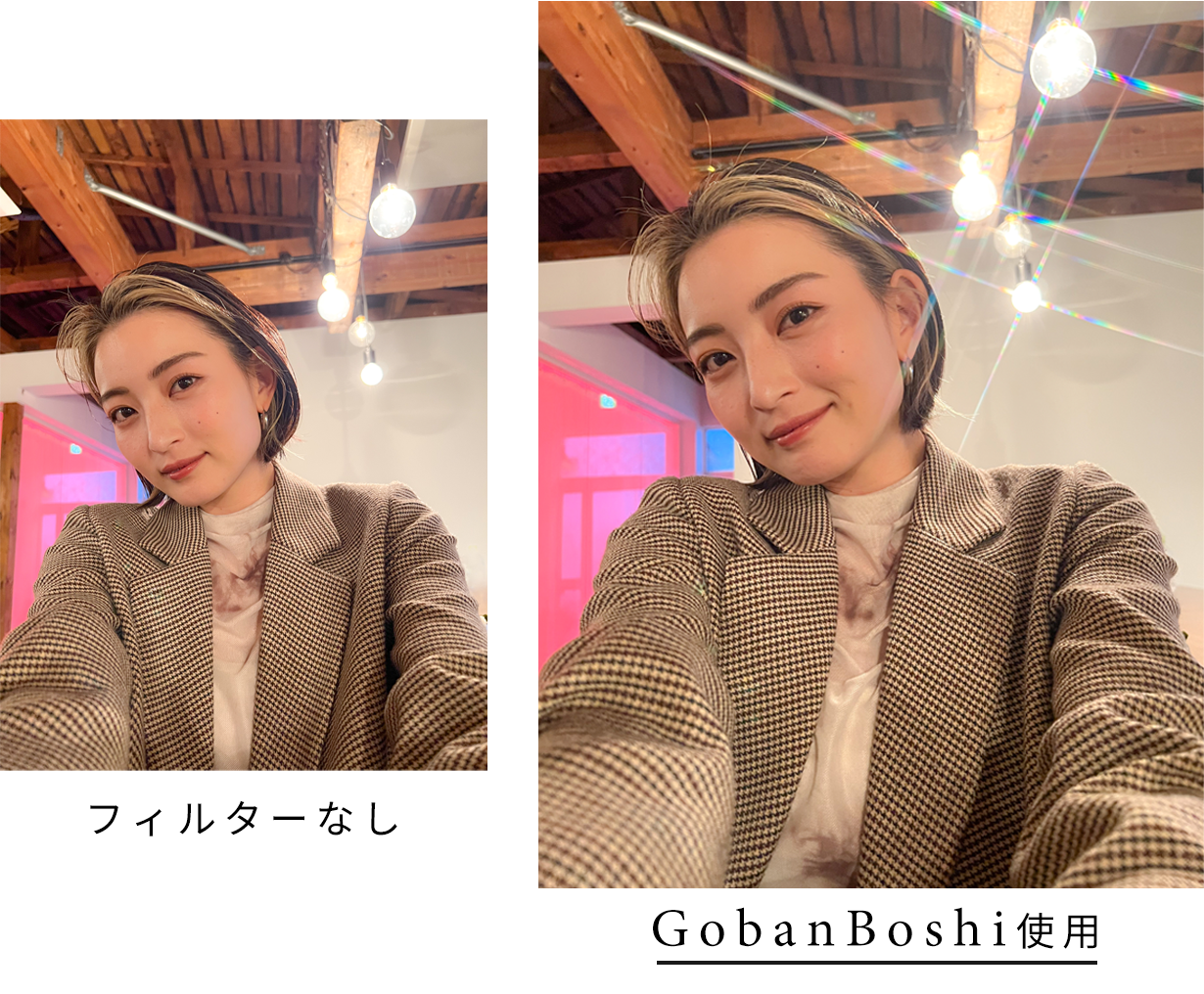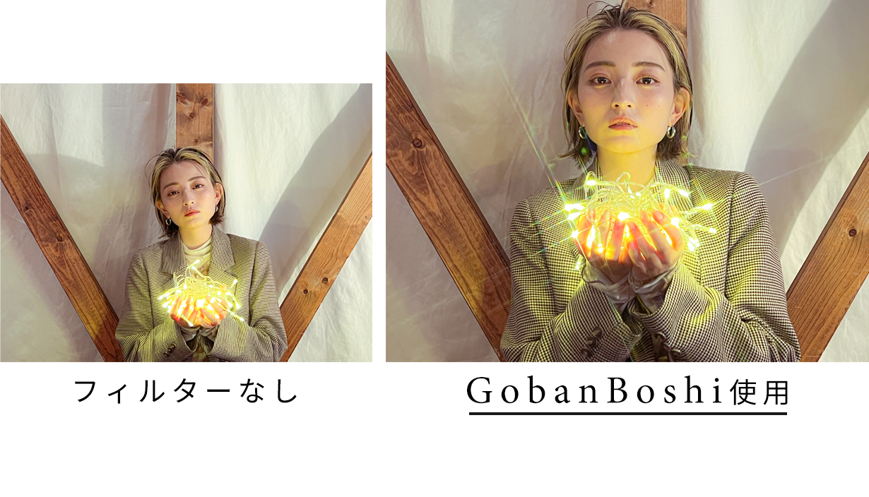 THE emoの「GobanBoshi」は、シーンに映る光をクロス状に伸ばす、スマホカメラ用のクロスフィルター。瞬く星のような煌めきが生まれ、作品が可憐な印象に仕上がります。
