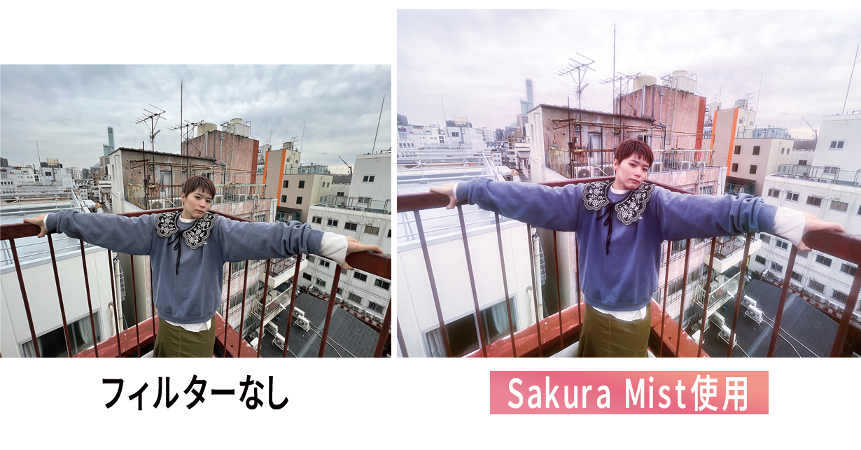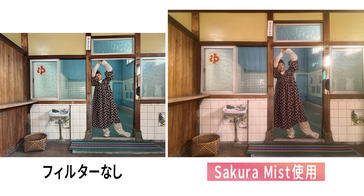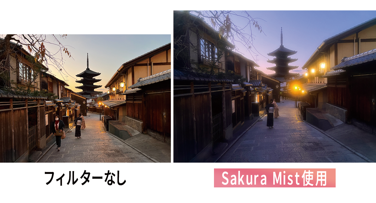 光を拡散させてボケ感を出すブラックミストフィルターに、桜色の特殊コーティングを施した【SakuraMist】。光源を柔らかいタッチで表現すると同時に、ほんのりと桜色をプラスすることで、他とは一味違ったエモい作品に仕上がります。